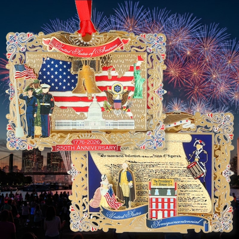 This ornament is a Salute to America! Our 250th Anniversary of the United States - American Heritage Collection® Ornament is finished in 24k gold and is only available here.