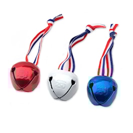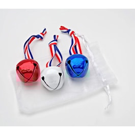 Three Red, White, and Blue 1.5" Nickel sleigh bells, with the official AMERICA 250 logo stamped into the bell, strung with Red, White, and Blue striped ribbon. This 3-Pack comes with 3 AMERICA 250 Sleigh Bells (red, white, & blue) in a White organza bag.