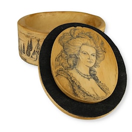 From of ancient maritime folk art, original pieces date back to the 1800’s. Whalers carved designs in the teeth and bones of whales in their idle time. This scrimshaw is hand cast in polymer resin a reproduction ivorine product. Hand-inked and antiqued in the US by hand. Artwork of Abraham Lincoln is original to the artist. Lady Hamilton is etched on the underside of the cover. JFK, a collector of scrimshaw was buried with a whale tooth engraved with the Presidential Seal.