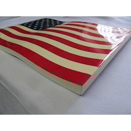 American Flag Plaque. 8 x 10 x .75. Red, white and blue waving surface.Hook to hang on wall or put on small easel. Made in China.
