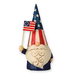 Jim Shore's Gnomes Around the World collection is a whimsical celebration of symbols and customs from nations near and far. The American Gnome waves Old Glory while wearing a colorful hat festooned in Stars and Stripes.