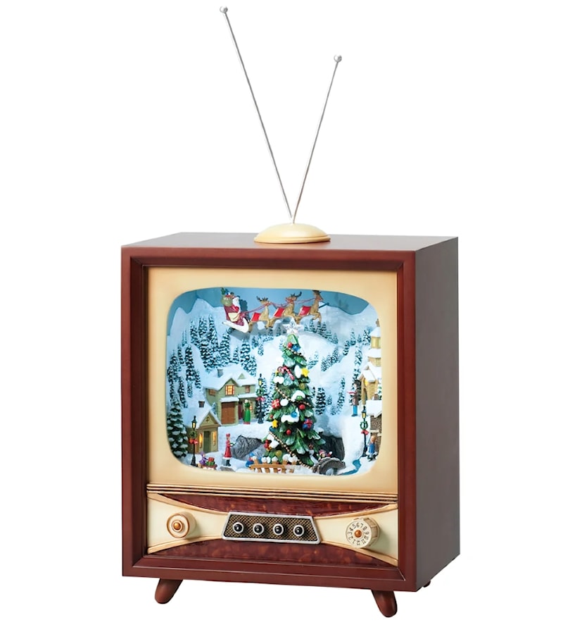 Relive the wonder of Christmas past with this enchanting retro TV display. A snow-covered village sparkles with holiday lights as a festive train circles the town square, children gather by a glowing Christmas tree, and Santa soars above in his sleigh. The scene comes alive with motion, light, and classic carols, creating a nostalgic centerpiece that captures the heart of the season.