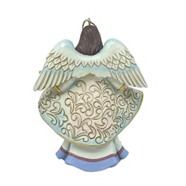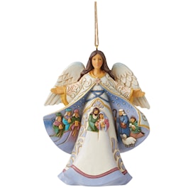 Arms outstretched in praise and glory, this striking angel boasts an army in her wings while her billowing cloak reveals the manger scene. With beautiful craftsmanship and radiant rosemaling, this angel tells the story of the first Noel with color.