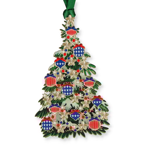 Betsy Ross Flag Ornament with red and white stripes with a circle of 13 white stars on a field of blue. The flag was made for the first 13 colonies.