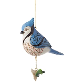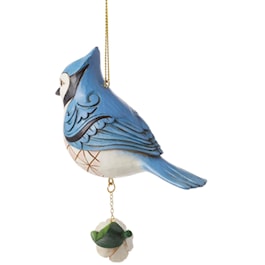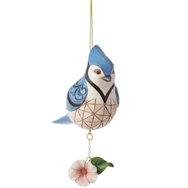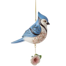 This lovingly crafted bird ornament by Jim Shore resembles a real Blue Jay. With the artist's iconic patchwork patterning and rosemaling, the beautiful bird perches on a flower as it hangs. Bring the magic of the outdoors in with this pretty piece.