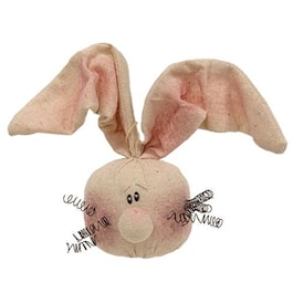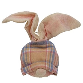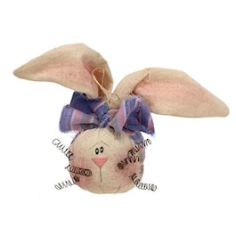 Bunny Ornaments sell as a set of three plush bunny heads on fabric string hangers. Each is painted with rosy cheeks and has a pair of wired, adjustable bunny ears. Other details include pastel, Easter-like plaid accessories, wire spiral whiskers, and round, gnome-like noses.