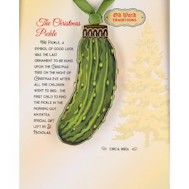 The pickle, a symbol of good luck, was the last ornament to be hung upon the Christmas tree on the night of Christmas Eve after the children went to bed...the first child to find the pickle in the morning got an extra special gift left by St. Nicholas.