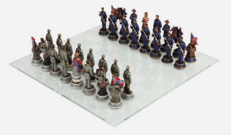 The Pacific Trading chess set is a hand-painted, military-themed set with polyresin pieces and a glass board. The board is 17 inches by 17 inches and is made of glass with frosted and clear squares.