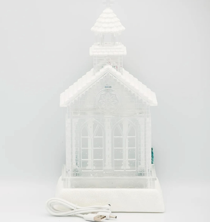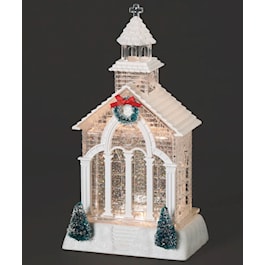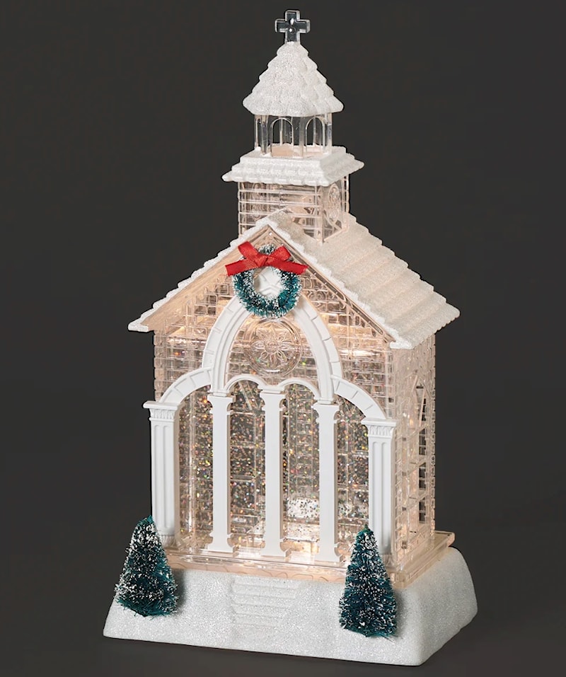 Celebrate the season with this illuminated swirl church featuring a green tree and festive wreath. The gentle glitter movement and warm light bring a peaceful charm to your holiday display.