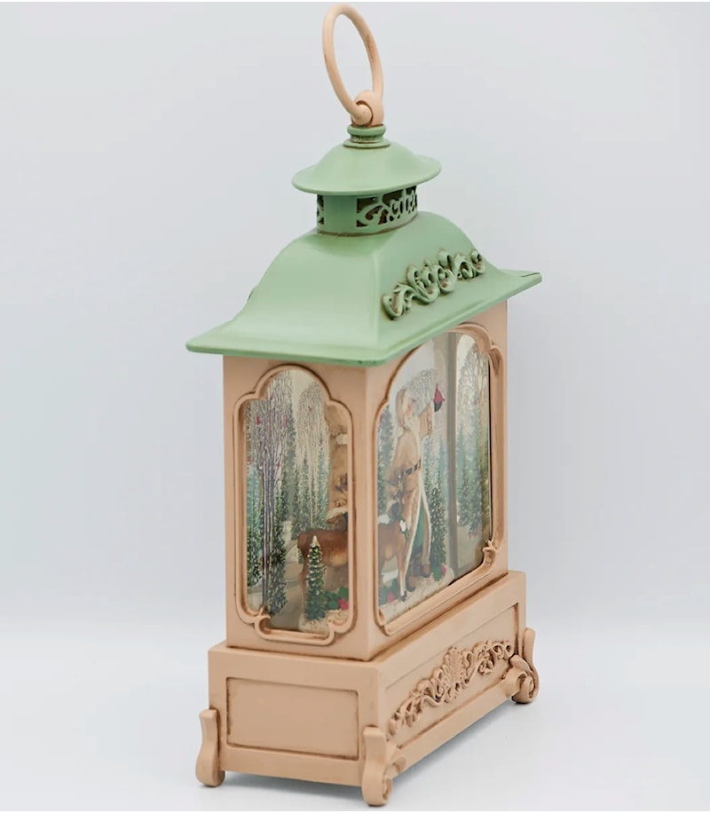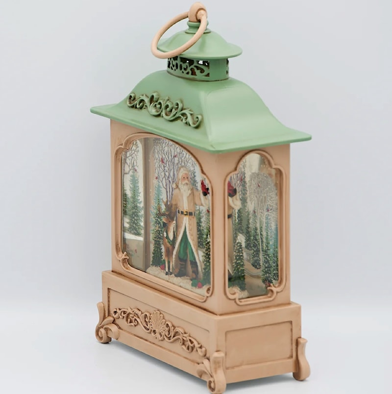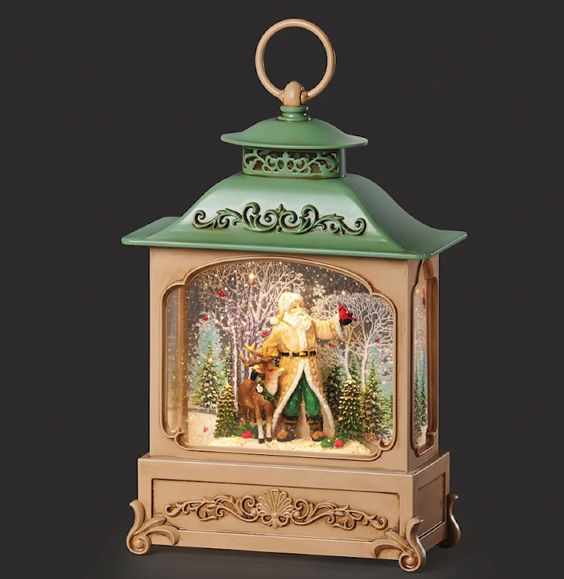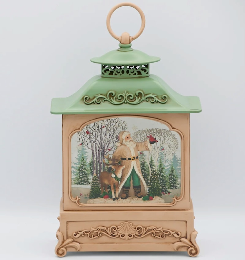 Celebrate the season with this festive lighted swirl lantern. Santa stands with a reindeer beneath a charming green roof, as glitter swirls in the glow of warm light. A classic and heartwarming holiday display, it’s perfect for mantels, shelves, or entryway décor and makes a timeless addition to your Christmas collection.