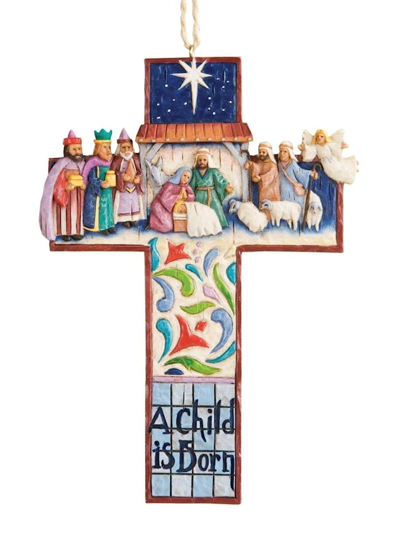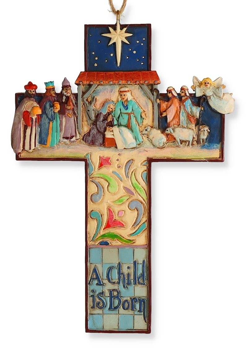 Jim Shore's Cross Nativity Scene Ornament features a full nativity scene on a blue cross. Handcrafted in exquisite detail, this enchanting keepsake is a holiday gift sure to be treasured in the years to come.