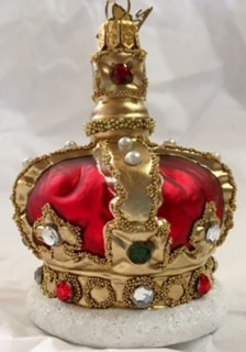 Brillant Red and Gold Crown Ornament. The gold strips across the crown are adorned with pearls, red, green and clear crystals. White glittered fur-like base on a truly beautiful ornament. 3.25" x 2.5" x 2.5"
