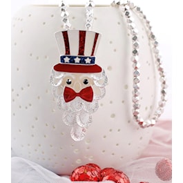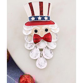 Silver tone magnetic clasp 4th of July pin/pendant featuring a dangle beard Uncle Sam design with glitter enamel accents. Pin/pendant measures approximately 3" in height.