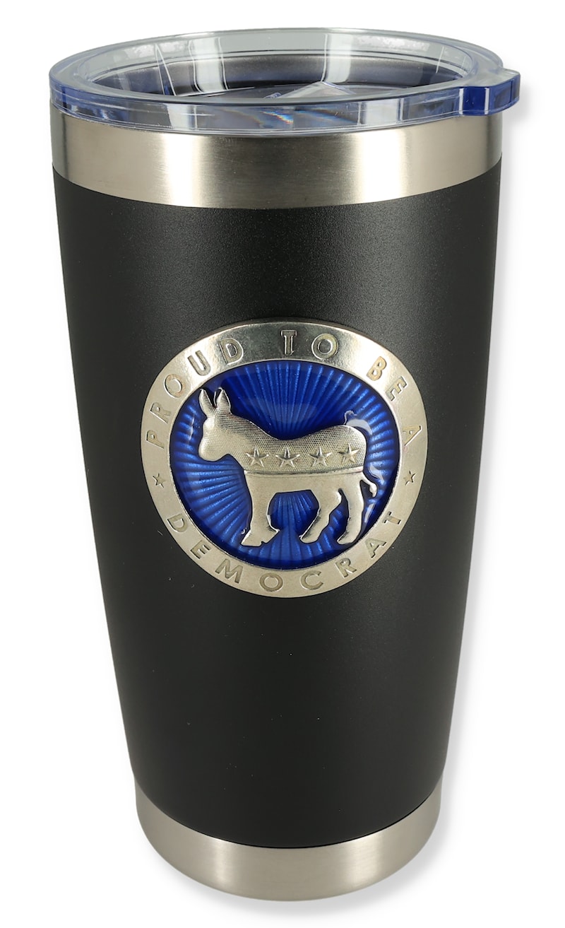 Show your support for the Democrat Party with this travel mug. This 15 oz double wall stainless steel (no handle) travel mug is insulated and it is stainless inside and out. It is embellished with a fine pewter decorative casting. The lid has a non-spill feature. The absence of a handle makes it perfect for you car's drink holder.