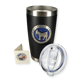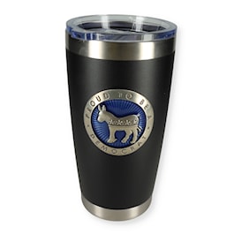Show your support for the Democrat Party with this travel mug. This 15 oz double wall stainless steel (no handle) travel mug is insulated and it is stainless inside and out. It is embellished with a fine pewter decorative casting. The lid has a non-spill feature. The absence of a handle makes it perfect for you car's drink holder.