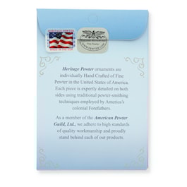 This fine pewter ornament is detailed on both sides. It comes with satin ribbon and in a window package. Use it on your tree, car mirror, or other applications!