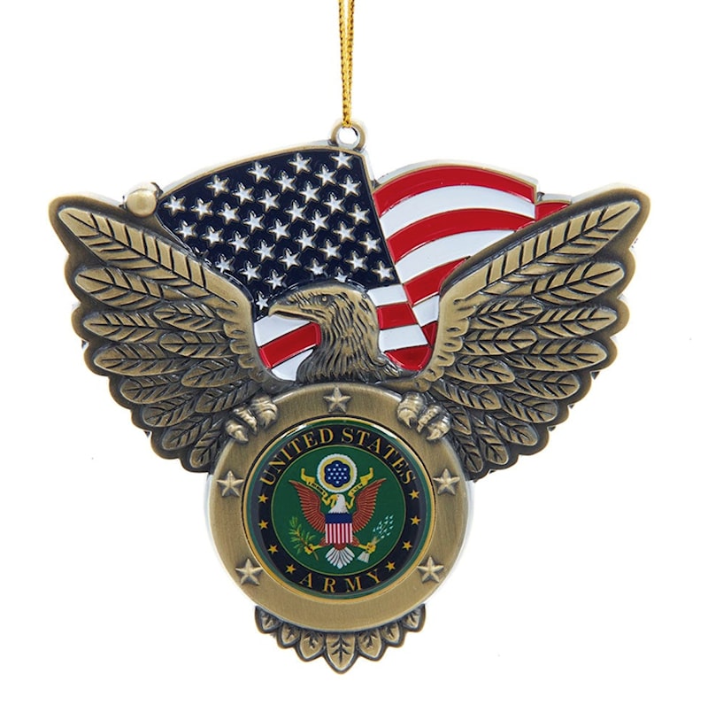 This wonderful design is the symbolism for military pride and patriotism. It features a platinum eagle with the wings spread out and etched feather patterns with the official U.S. Army seal in the middle and a glossy red, white and blue US flag design in the background. Give it as a gift any time of the year. Each includes a gold ornament string. The tag attached to the string is green on the front with the Army Star design and "official licensed product of the U.S. Army".
