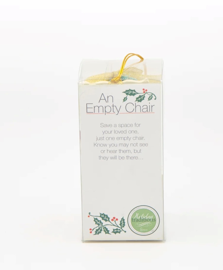Honor loved ones this season with the Empty Chair Memorial Ornament from the Holiday Traditions collection. Made of wood with a festive wreath and golden bow, it carries the touching message: “Save space for your loved one; just one empty chair. Know you may not see them, but they will be there...” A comforting keepsake to remember those no longer with us.