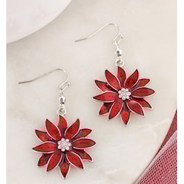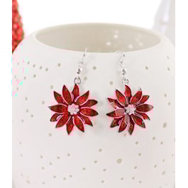 Silver tone shepherd hook earrings featuring an enamel poinsettia with crystal accents. Poinsettia measures around 1" in size.