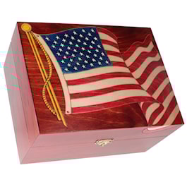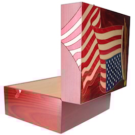 This large hand-crafted patriotic box is decorated with the American flag, billowing in the wind. Parts of the flag run over onto the sides of the box. The box is secured with a front latch.