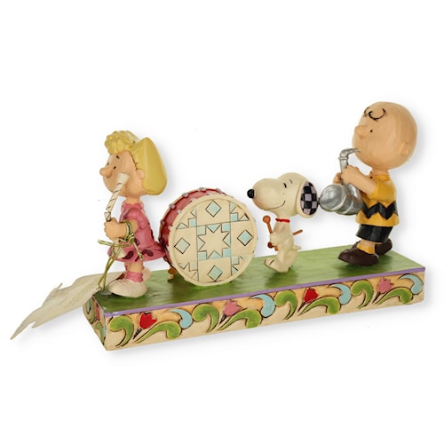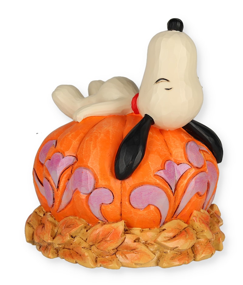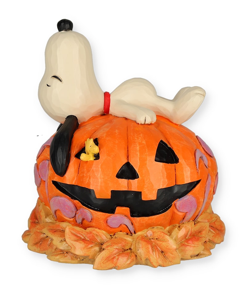 Somewhere in the pumpkin patch, Linus and Charlie hunt for the great pumpkin. Meanwhile, Snoopy is on a quest of his own, to find the comfiest jack-o'-lantern for a snooze. Finding a handsome gourd, the pup naps in this playful Jim Shore design.