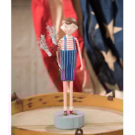 This Firecracker Boy is dressed in a red and white striped shirt and white and blue stripe overalls. Place this piece with your other patriotic figures for this Fourth of July! This handmade piece is a wonderful addition to any Americana or Patriotic collection and display!