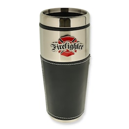 This stainless steel, 16oz, double-wall tumbler features a firefighter badge.