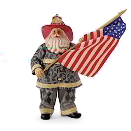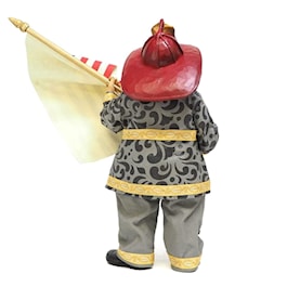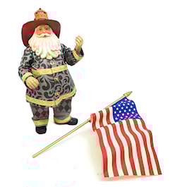 Jim Shore designed this Firefighter for Possible Dreams as a tribute to the 9/11 Heroes. The coat, pants and flag are Clothtique Fabric.
