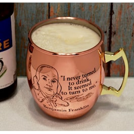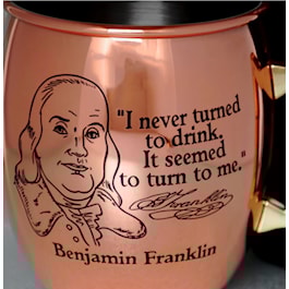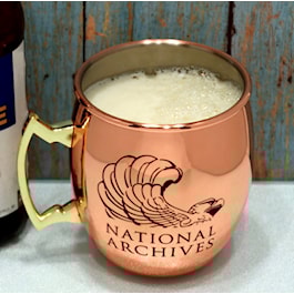 Great for keeping any beverage cold, this lined copper mug features the Archives logo on one side and the likeness of Benjamin Franklin and one of his numerous quotes about drinking on the other. Inventor, diplomat, and Founding Father, Franklin was also a brewer and distiller, and he would surely marvel at how refreshing his drink would stay in one of these vessels. Exclusive to the National Archives Store, this 17oz. mug is a great addition to the bar room. It makes a nice gift set together with the copper mule shot.