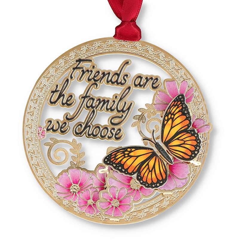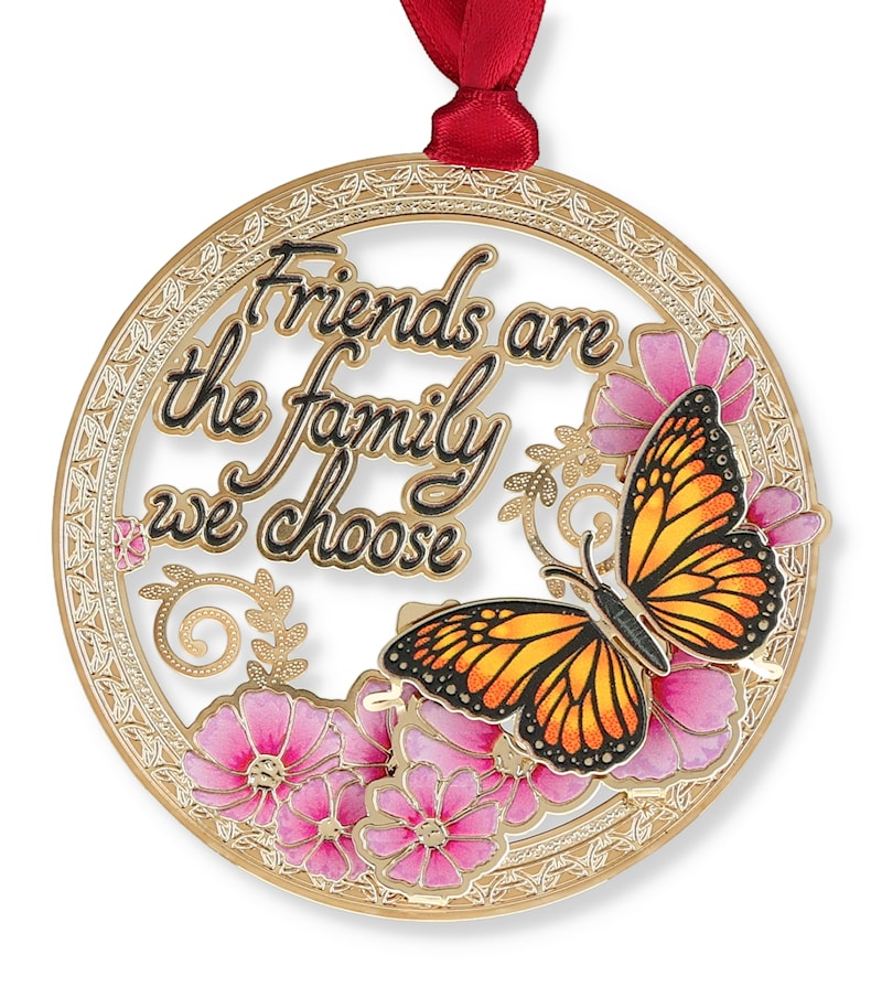 This beautifully handcrafted ornament is made from solid brass, 24kt Gold finish, with digitally printed color. Packaged in an elegant window showcase.