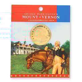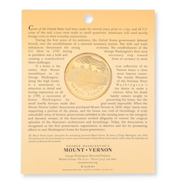 This Mount Vernon commemorative coin shows the east front of the mansion on one side with a profile of George Washington with thirteen stars symbolizing the thirteen original states of the union during Washington’s presidency on the reverse.