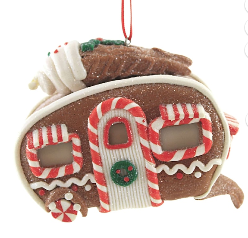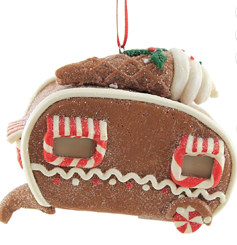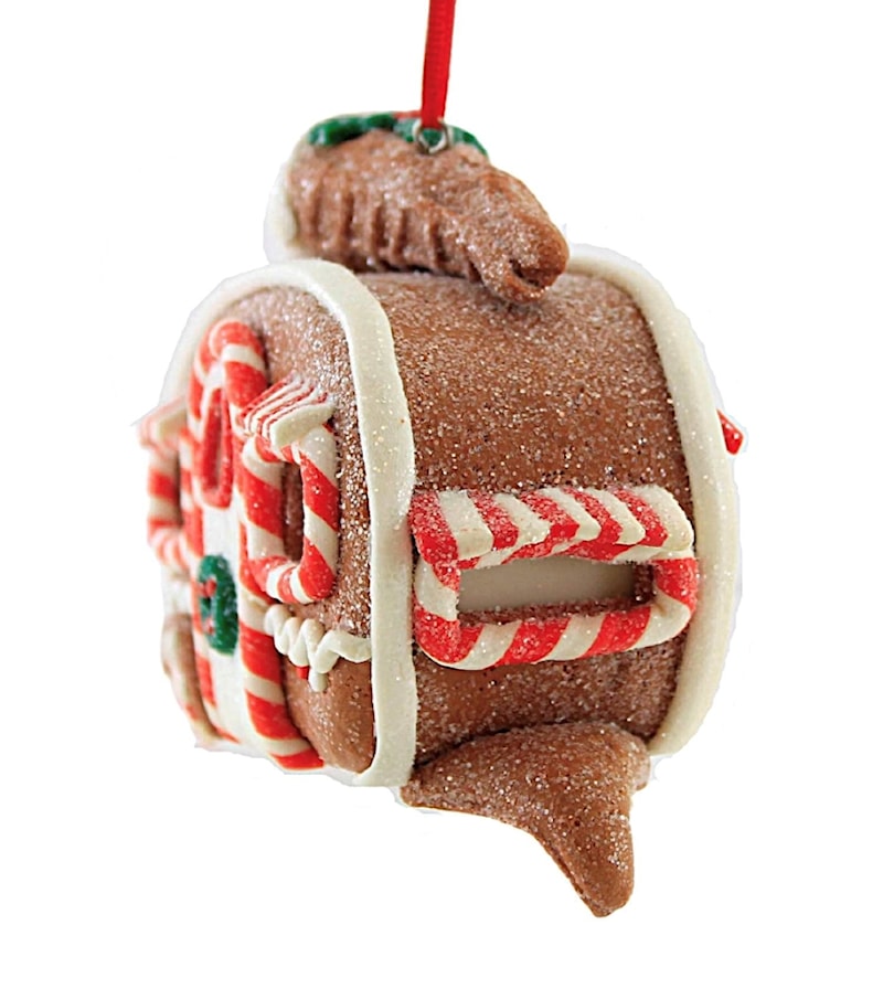 This ornament is embellished with a sugary glittery coating. A red satin ribbon is attached to the ornament for hanging. This is a unique addition to your tree this year!