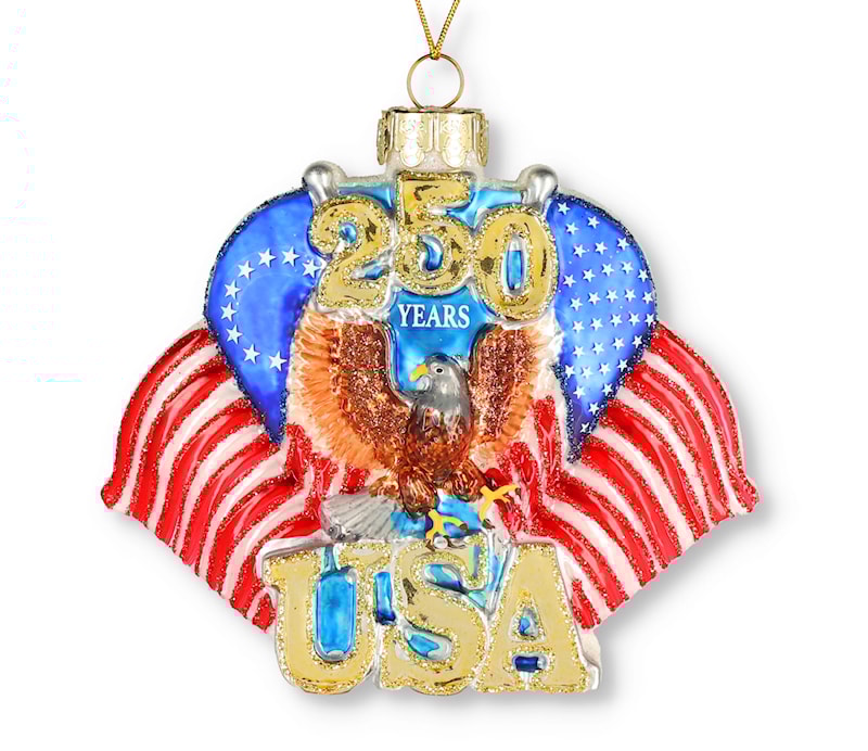 Celebrate 250 years of American independence with Kurt Adler's Glass 250th Anniversary U.S. Flag Ornament. Expertly crafted with elegant details, this ornament features a vibrant design of the U.S. flag, symbolizing the rich history and enduring spirit of the nation. Perfect for commemorating this historic milestone, it’s a stunning addition to holiday décor or a cherished keepsake for collectors and patriots alike.