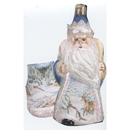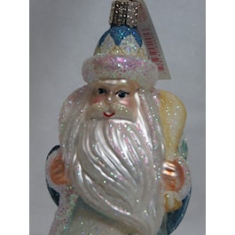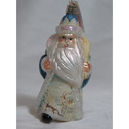 Glistening Father Frost. Entirely crafted by hand. Mouth blown glass figure. Unique glistening ornament. Delicately detailed front and back. Miniature work of art, a treasured family heirloom. 5 1/2". Gift Boxed.