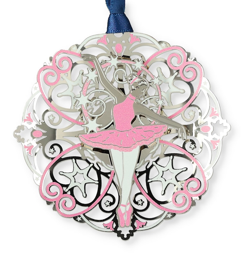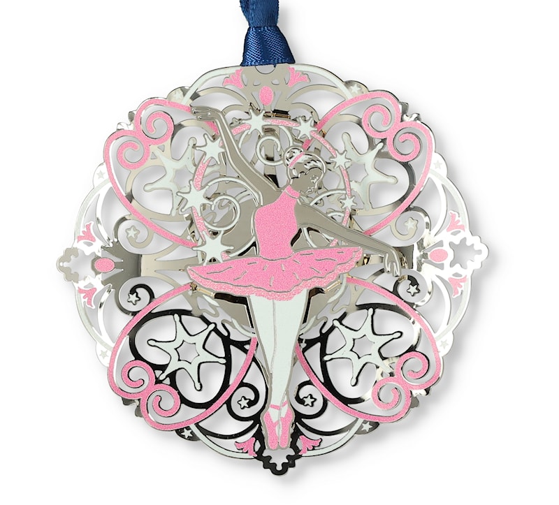 This two dimensional brass ornament depicts a graceful ballerina in pink posing in front of a delicate design.