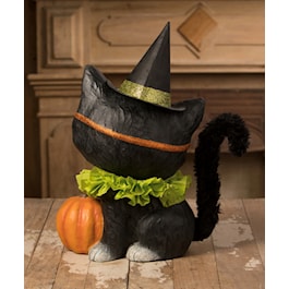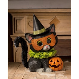 Halloween Kitty Binks is here to delight. This adorable paper mache kitten is wearing a green tisse paper collar, orange glittered mask, witch hat with green glittered band and a fantastic black chenille tail. He is with his smiling Jack-O-Lantern enjoying the Halloween festivities. Light not included. Bethany Lowe Designs creates vintage inspired, artisan crafted holiday decor perfect for your home!