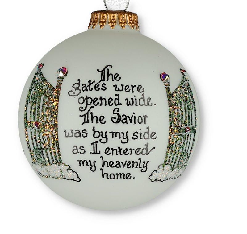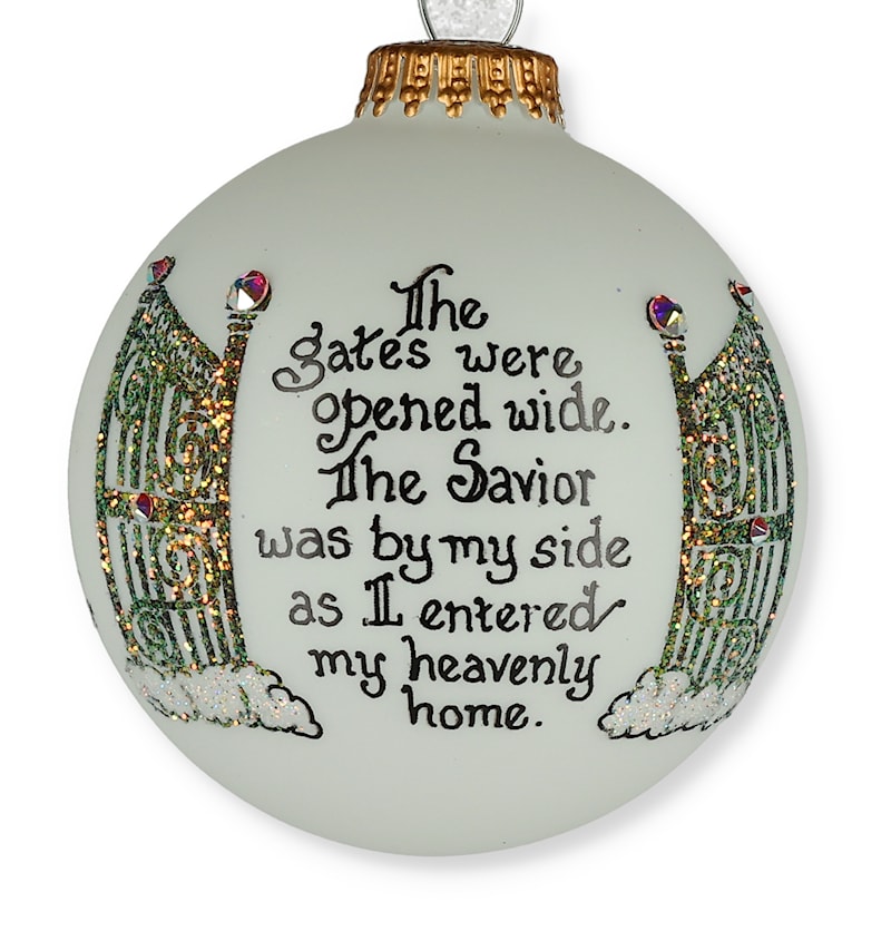 This sympathy greeting ornament will be a comforting gift for someone has recently lost a loved one. This ornament sentiment reads: "The gates were opened wide. The Savior was by my side as I entered my heavenly home".