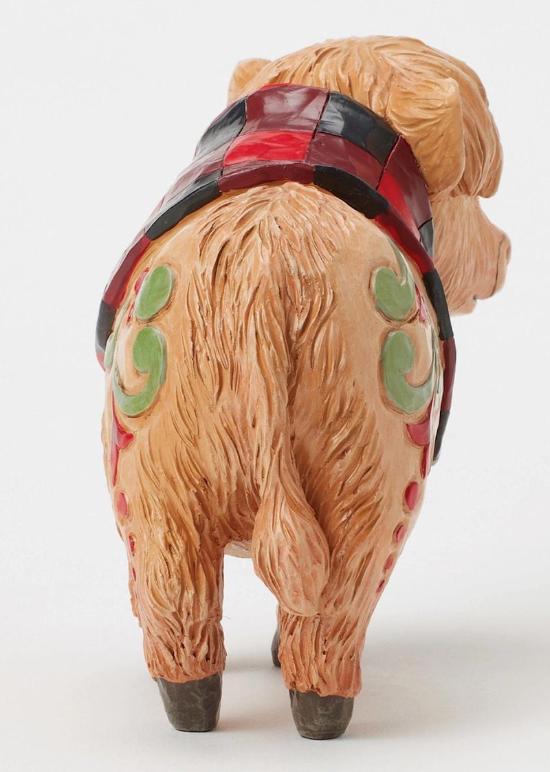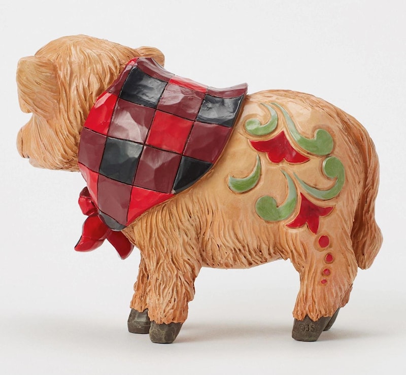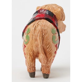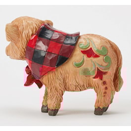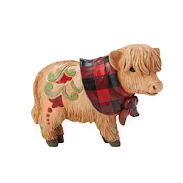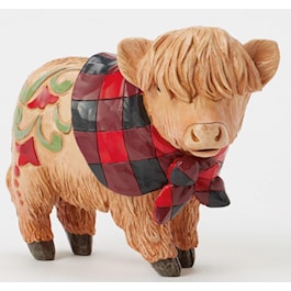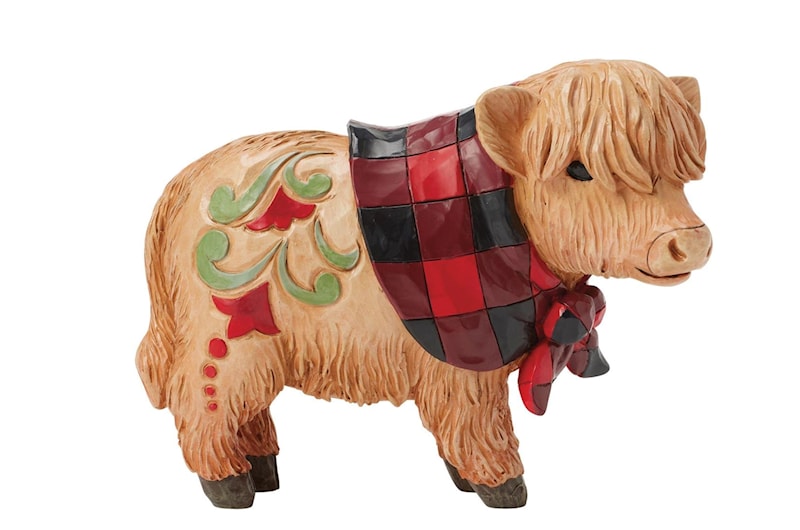 This charming Jim Shore Highland Glen piece features a delightful Highland cow in a cozy buffalo plaid scarf with red and green floral details on its hide. With its warm expression and festive accents, this piece gives an elevated sense of holiday cozine
