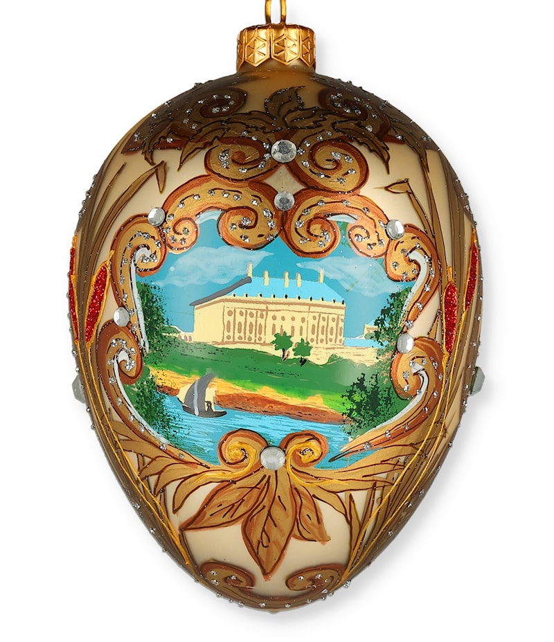 This romantic mid century painting of the President's House, that appears on the egg shaped ornament, was executed by an unknown artist after a drawing of the White House by the English artist, William Henry Bartlett, who visited North America in 1836.The art, "View from the Tiber", as it was called, depicted the lush foliage on the south grounds of the White House with the Tiber Creek in the foreground. A boat sails on the water. This painting was given to the White House in 1967. Even before that, the scene was a favorite of Jacqueline Kennedy, who painted it as a gift for her husband. Tiber Creek was filled in during the 1880's, and today runs under Constitution Avenue.