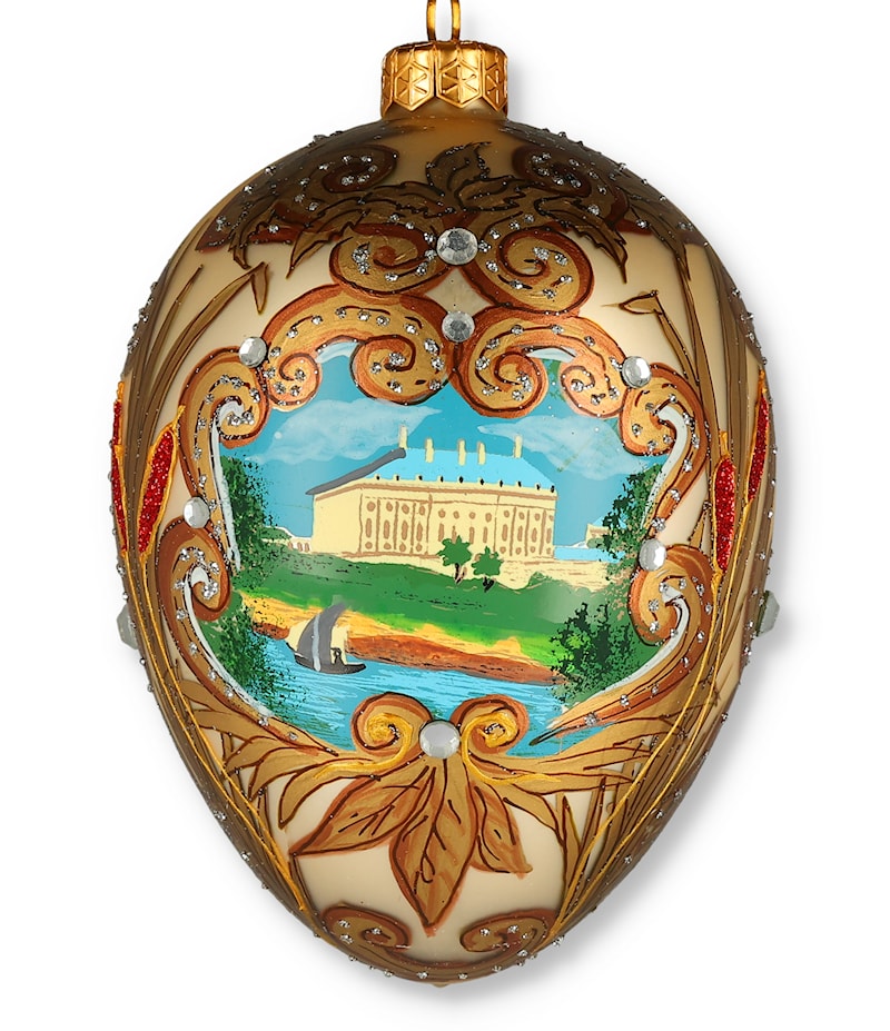 The artwork is surrounded by a rustic scene of cattails and crystallized decorum that frame the design. The 4" egg shaped ornament is mouth blown and hand decorated by skilled artisans in one of the finest factories in Poland.