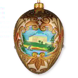 This romantic mid century painting of the President's House, that appears on the egg shaped ornament, was executed by an unknown artist after a drawing of the White House by the English artist, William Henry Bartlett, who visited North America in 1836.The art, "View from the Tiber", as it was called, depicted the lush foliage on the south grounds of the White House with the Tiber Creek in the foreground. A boat sails on the water. This painting was given to the White House in 1967. Even before that, the scene was a favorite of Jacqueline Kennedy, who painted it as a gift for her husband. Tiber Creek was filled in during the 1880's, and today runs under Constitution Avenue.