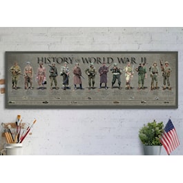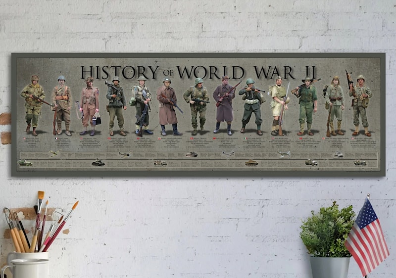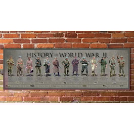 From the invasion of Poland to Japan’s surrender, learn about the world’s deadliest war. The thirteen soldiers represent ten countries, including: the United States, France, Great Britain, Germany, Canada, Poland, the Soviet Union, Italy, Australia, and Japan. The 56-point timeline includes dates, facts, and twelve iconic land and air weapons.