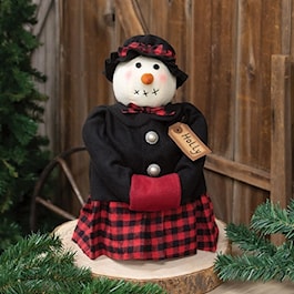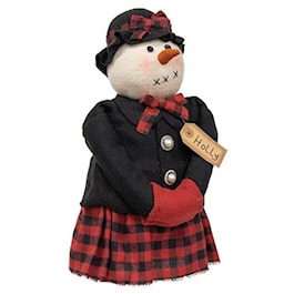 Bring a little country charm to a corner of your home with this Holly Snowwoman Doll. Dressed in a black felt coat and cap with a buffalo plaid skirt and accents, this doll is a fun way to complete a holiday look. Rest it on a mantelpiece or place it next to a floral arrangement to add a pop of Christmas color that everyone will love.