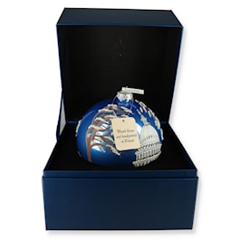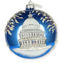 This Jeweled Capitol Dome Glass ornament is made exclusively for White House Holidays. The 6 inch mouth-blown glass ball is hand painted and ornately decorated with fine crystals and brilliantly colored glitter. The ball ornament is hand-crafted in one of the finest factories in Poland.