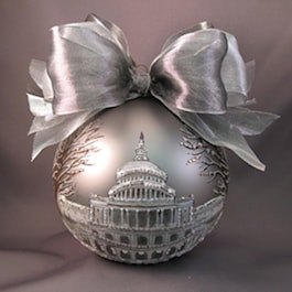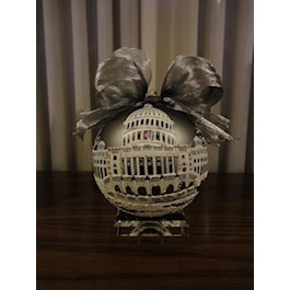 Jeweled Capitol Table Ornament. Hand Painted and Hand decorated with pearls and jewels. 6" Glass Blown Ball with Pewter background color. Elegant coordinating bow. Made in America by Sarabella. Velour embossed gift box. Exqusite gift for that special person.