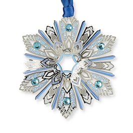 This ornament is beautifully handcrafted in the USA from solid brass, 24kt gold finish, and with digitally printed color. It also contains swarovski crystals.