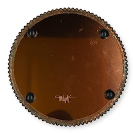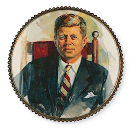 John F. Kennedy Decoupage Wine Coaster features a portrait of the 35th president in his rocking chair. This executive piece was designed on glass with copper beading by Willan F Inc. A commemorative gift honoring JFK's 100th Anniversary would look lovely on an easel.
