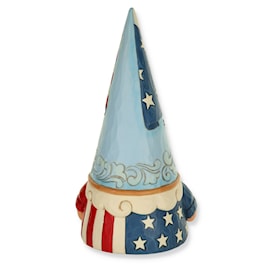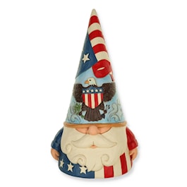 No one knows gnomes like Jim Shore! Donning the colors of the USA, this bearded gnome wears his country's flag and symbol on his hat. In a suit of stars and stripes his patriotism outshines the garden. Celebrate America, gnome of the free.