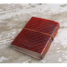 • Material: Sustainable salvaged leather cover material with a string tie closure.