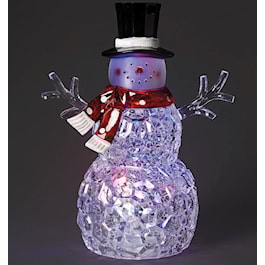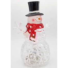 Add cheerful sparkle to your holiday decor with this snowman figure. Featuring a textured, gem-like body that glows with rotating multicolor lights, this frosty friend is dressed in a top hat and polka-dot scarf. A fun and festive addition to mantels, tabletops, or entryways.